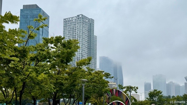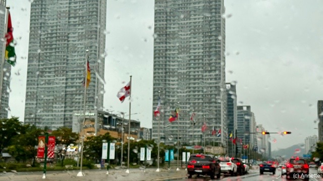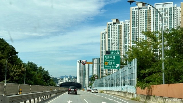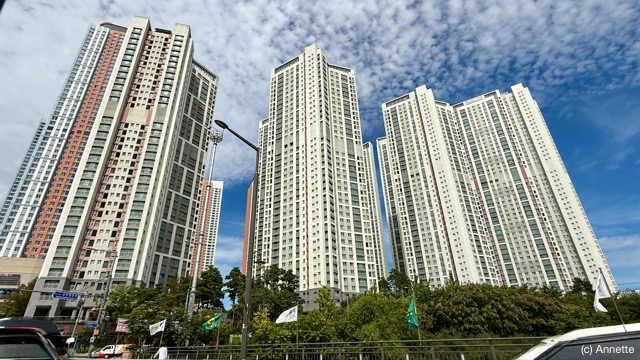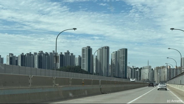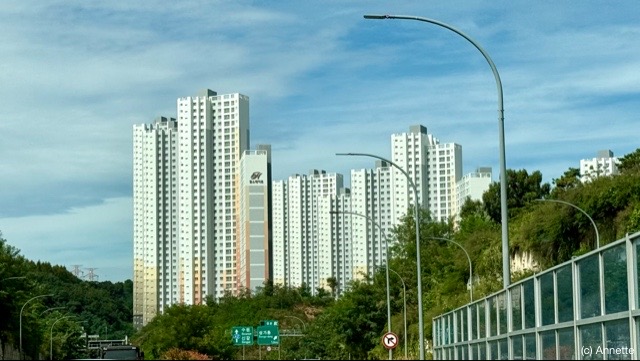 Überall in Korea stehen diese Wohnhäuser, die sich extrem gleichen. Viele Etagen, immer mehrere zusammen.